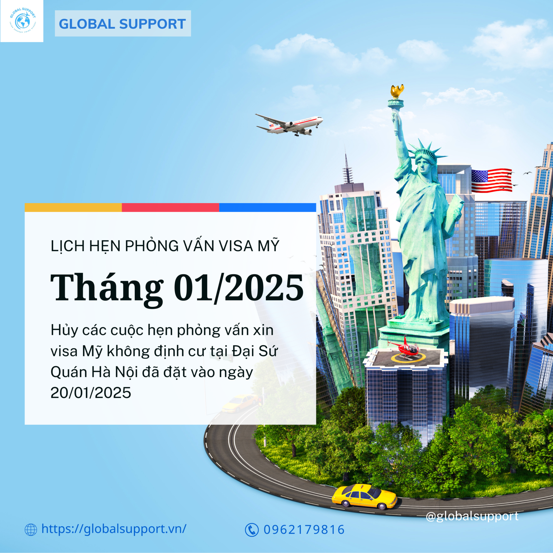 Theo ghi nhận từ chuyên viên hỗ trợ lịch hẹn của Global Support, một số khách hàng có ngày hẹn phỏng vấn vào ngày 20/01/2025 đặt tại Đại Sứ Quán Hà Nội đã nhận được thông báo hủy lịch hẹn visa Mỹ không định cư do thay đổi thời gian làm việc của Phòng lãnh sự quán Hoa Kỳ và hiện đã được chúng tôi hỗ trợ đặt lại lịch hẹn mới.